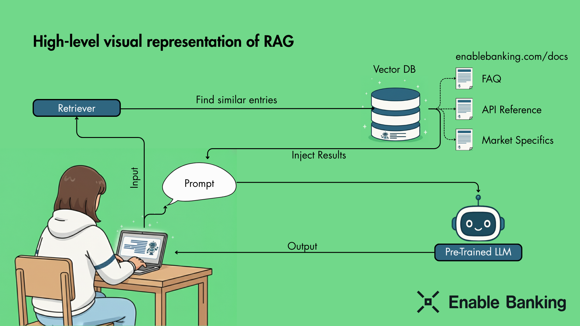 At Enable Banking, our public documentation is extensive and growing every day. We take pride in its amount and quality, but even with organised and well-structured FAQs and technical guides, it’s easy to forget where to find that one crucial snippet of information. To spend less time searching for relevant information and more time solving real problems, we developed a custom AI chatbot that allows us to essentially have conversations with our documentation. Along the way, we learned about different approaches and what makes our documentation both human and machine-readable.